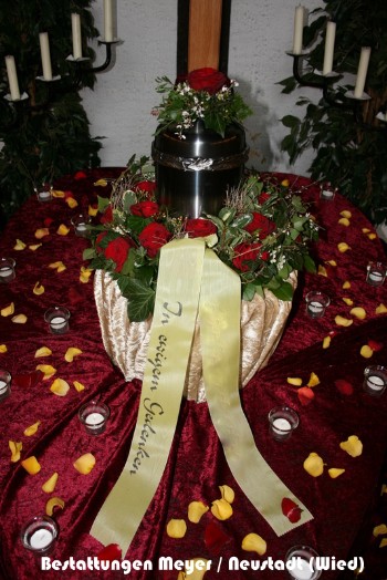 Bei der Feuerbestattung wird der Verstorbene in einem Sarg eingeäschert. Die Asche wird später in einer Urne beigesetzt. Dazu ist eine besondere Verfügung notwendig. Der Verstorbene muss zu Lebzeiten eine handschriftliche Willensbekundung mit dem entsprechenden Inhalt hinterlassen oder aber die Angehörigen geben eine sinngemäße Erklärung (Willensbekundung) ab. Das dafür vorgesehene Formulare dafür erhalten sie bei uns.